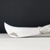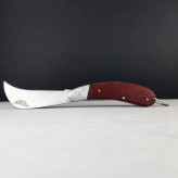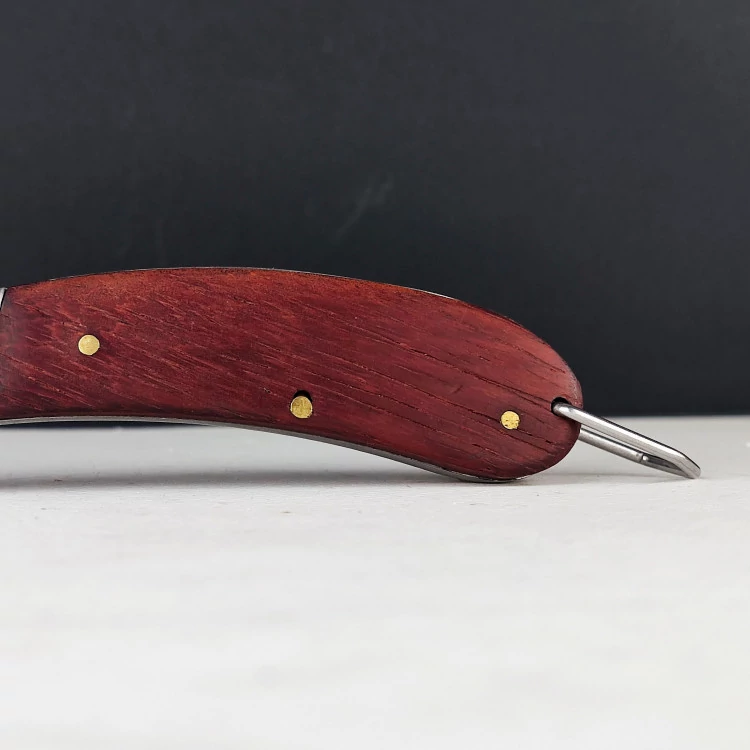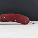 دسته این چاقو از فلز ساخته شده و با روکش چوب رز پوشانده شده است. این ترکیب علاوه بر زیبایی، استحکام و راحتی را برای کاربر فراهم میکند. چوب رز بهدلیل بافت طبیعی و مقاومت در برابر رطوبت، انتخاب مناسبی برای دسته ابزارهای باغبانی است.