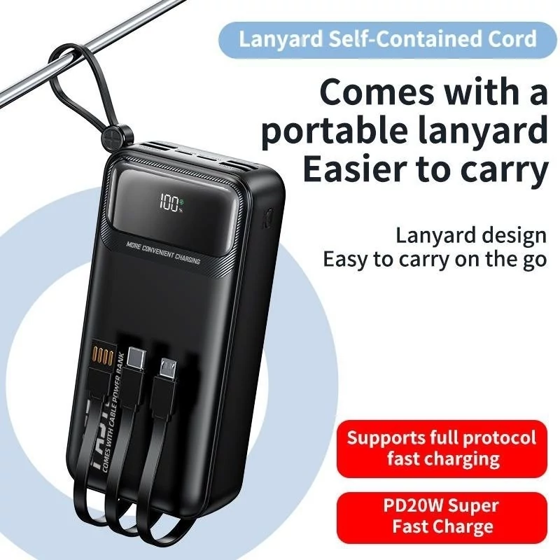 - کابلهای سرخود: دارای سه کابل متصل به بدنه (معمولاً شامل Type-C، Lightning و Micro USB) که نیاز به حمل کابل جداگانه را از بین میبرد.